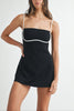 Minimalist yet striking, the Chic Contrast Piped Mini Dress is the ultimate go-to for effortless elegance. Designed with a sleek black body and eye-catching white piping detail, this dress creates a bold yet refined look. The fitted bodice with spaghetti straps and a subtly flared skirt offer a flattering silhouette that’s perfect for both day and night.