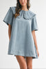Short sleeve ruffle detail peter pan collar denim dress with side pocket detail. Make a statement with this modern take on timeless classics. It's the perfect mix of fashion-forward style and versatile comfort! You will love this Peter Pan Collar Dress!