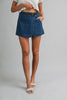 A modern twist on classic denim. This dark wash wrap-front skort gives you the look of a mini skirt with the comfort and confidence of shorts underneath. Designed with a structured high-rise waist and finished with an adjustable belt detail, it creates a flattering, tailored silhouette while staying effortlessly wearable.