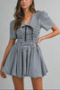 Sweet, feminine, and effortlessly charming — this gingham mini dress is your perfect warm-weather statement piece. Designed with a flattering smocked bodice that hugs comfortably while enhancing your silhouette, it features a romantic ruffle-trimmed collar and delicate front tie detail for a playful touch.